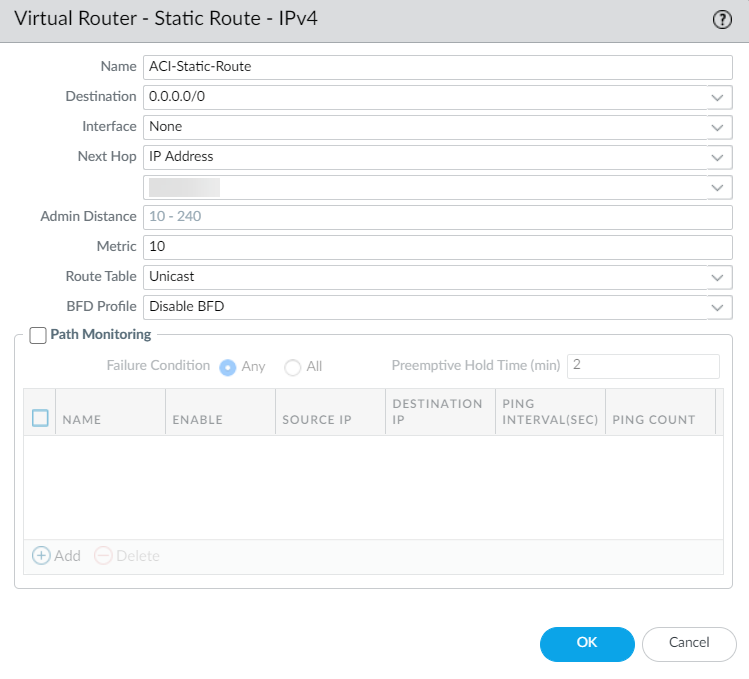 - Select NetworkVirtual Routers and click on the virtual router you created previously in this procedure.Select Static RoutesIPv4 and click Add.Enter a descriptive Name.Enter 0.0.0.0/0 in the Destination field.From the Interface drop-down, select the aggregate Ethernet group you created previously in this procedure.Select IP Address from the Next Hop drop-down and enter the IP address of the next hop router.Click OK.Click OK again.Commit your changes.