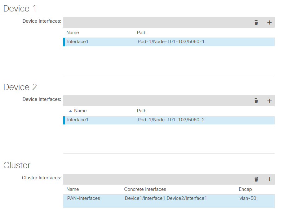 Under Device 1, click the plus (+) icon to the right of Device Interfaces.Enter a descriptive Name for this interface.Under Path, select the path to the primary firewall in your HA pair.Click Update.Under Device 2, click the plus (+) icon to the right of Device Interfaces.Enter a descriptive Name for this interface.Under Path, select the path to the secondary firewall in your HA pair.Click Update.Under Cluster, click the plus (+) icon to the right of Cluster Interfaces.Enter a descriptive Name for the cluster.Select the two interfaces you configured above from the list under Concrete Interfaces. The APIC requires that you configure two interfaces. However, because there is only one connection between the firewall and the ACI fabric, only one of the interfaces is used.Under Encap, enter a VLAN from the from the static VLAN pool you created earlier. Traffic will be redirected to the firewall on the VLAN assigned here.Click Update.Click Finish.