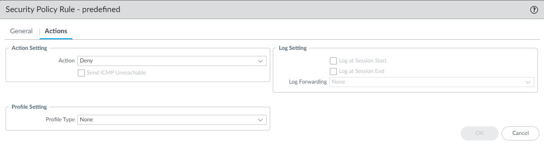 - Select PoliciesSecurity.Click on intrazone-default to highlight the row and click Override.Select the Action tab.Select Deny from the Action drop-down.Click OK.