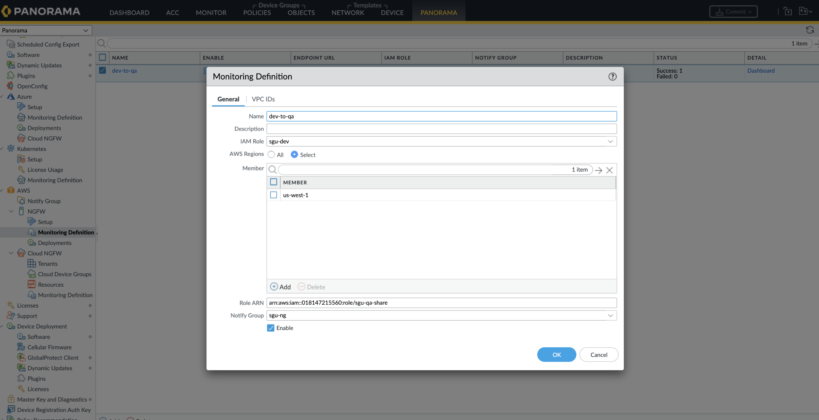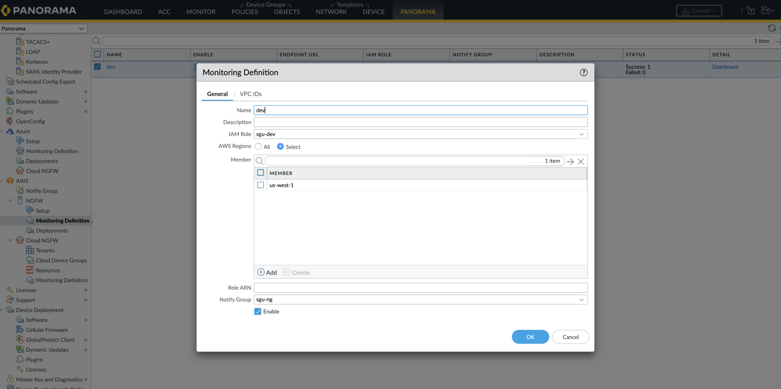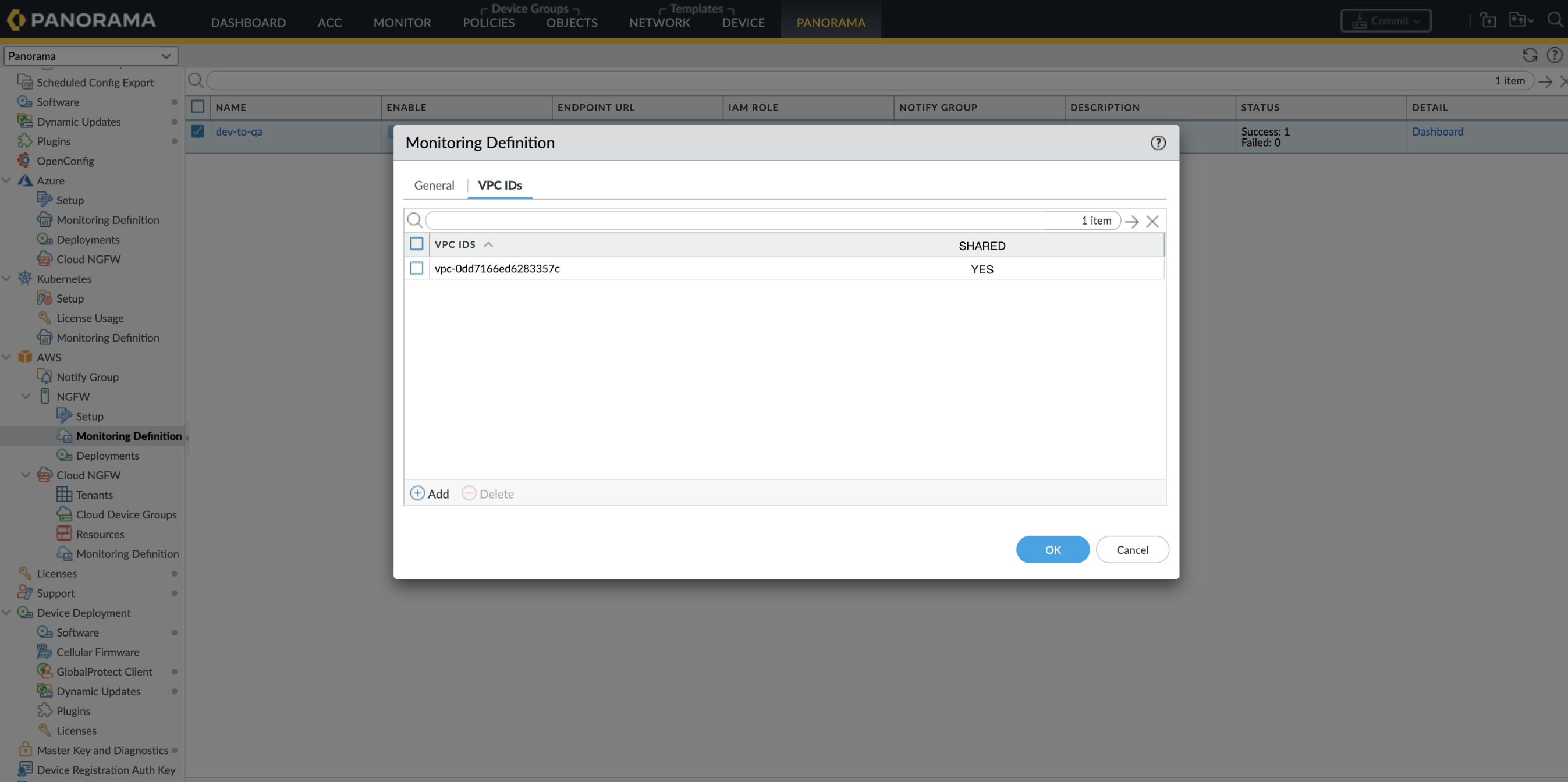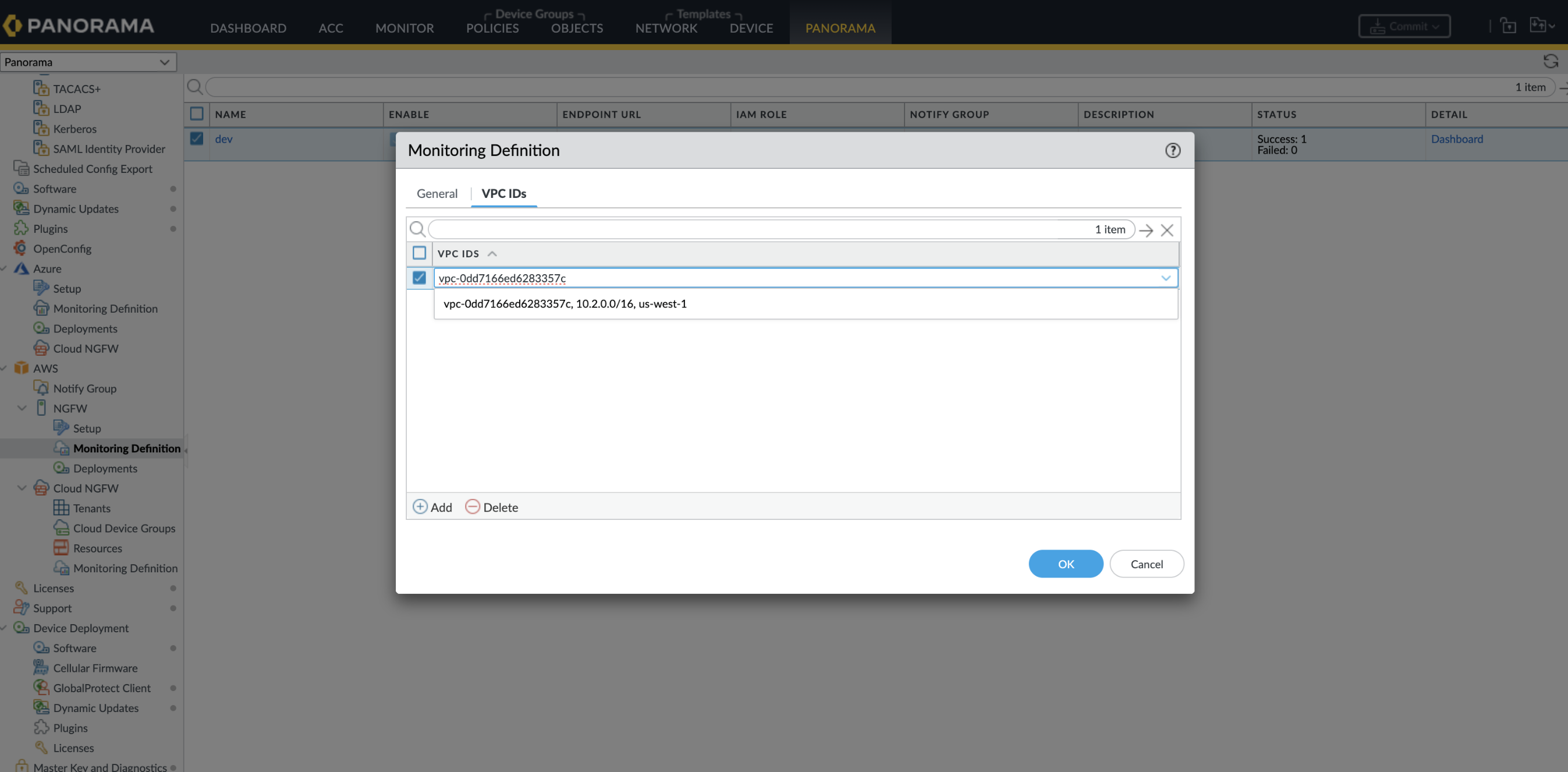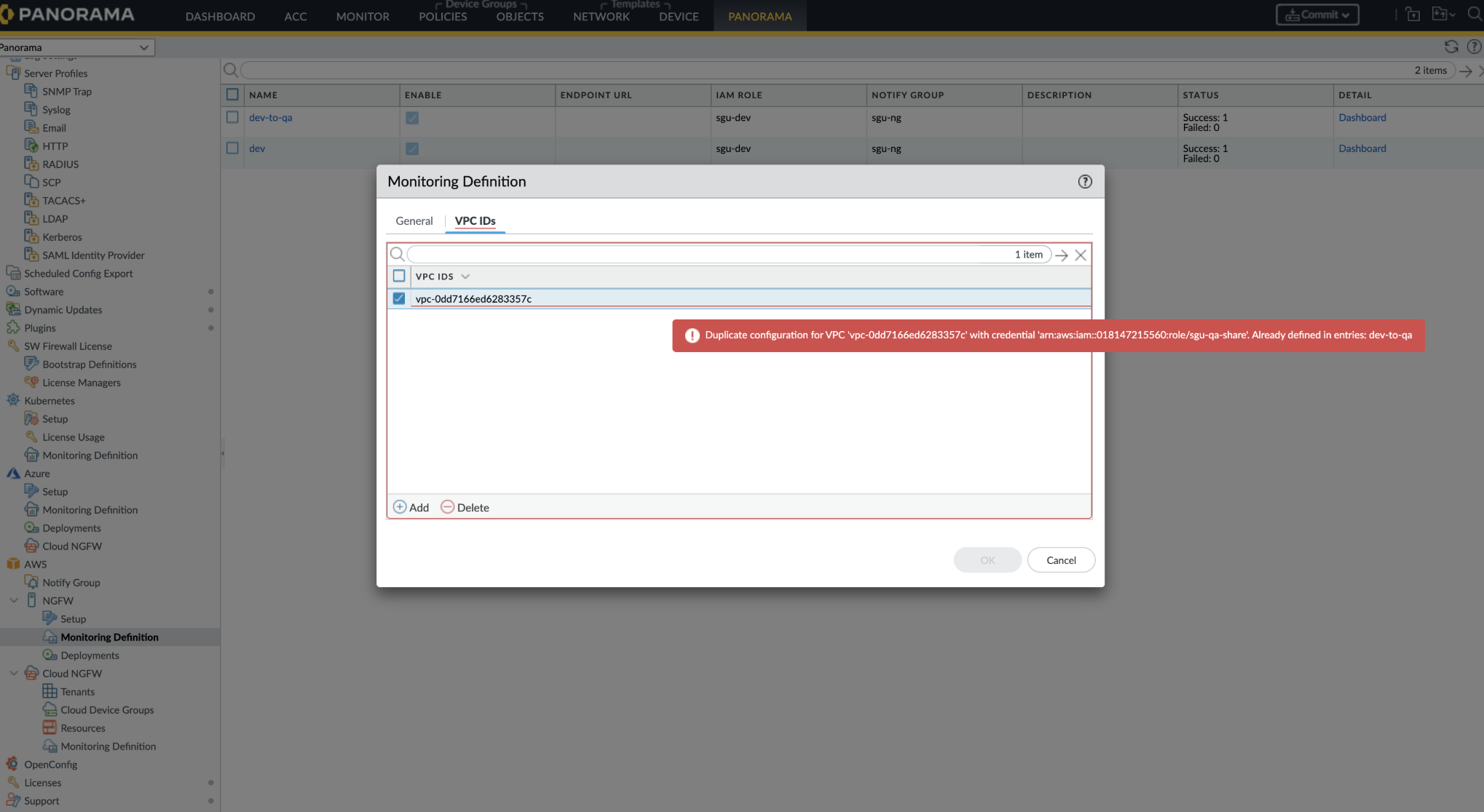 If you try setting up a monitoring definition using the same VPC-ID with the same credentials, the configuration window on Panorama throws an error message on a duplicate entry.