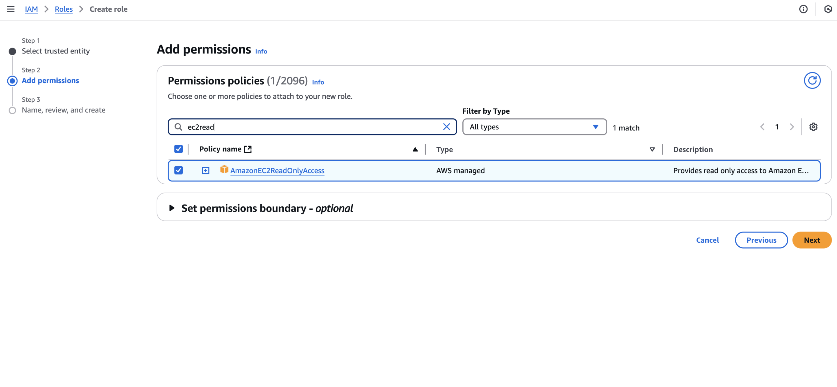 - Assign the AmazonEC2ReadOnlyAccess policy to the role.