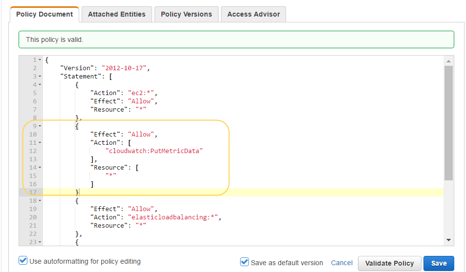 You can copy and the paste the permissions here:{ "Version": "2012-10-17", "Statement": [ { "Effect": "Allow", "Action": [ "cloudwatch:PutMetricData" ], "Resource": [ "*" ] } ] }Enable CloudWatch on the VM-Series firewall on AWS.- Log in to the web interface on the VM-Series firewallSelect DeviceVM-Series.In AWS CloudWatch Setup, click Edit () and select Enable CloudWatch Monitoring.