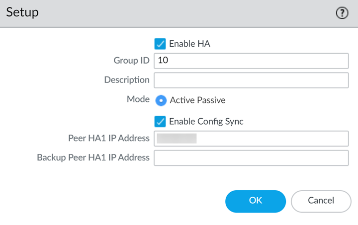 Repeat the above steps on the passive peer.Enable HA.- Select DeviceHigh AvailabilityGeneral.Edit the Setup settings.Enter the private IP address of the passive peer in the Peer HA1 IP address field.Click OK.