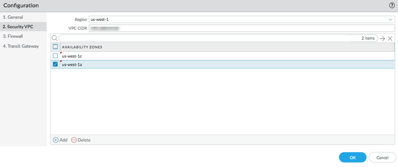 - Select two or more Availability Zones from the pre-populated list and follow the same mapping in AWS. This list is populated based on the region you selected.