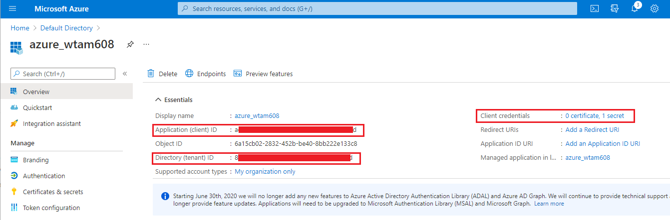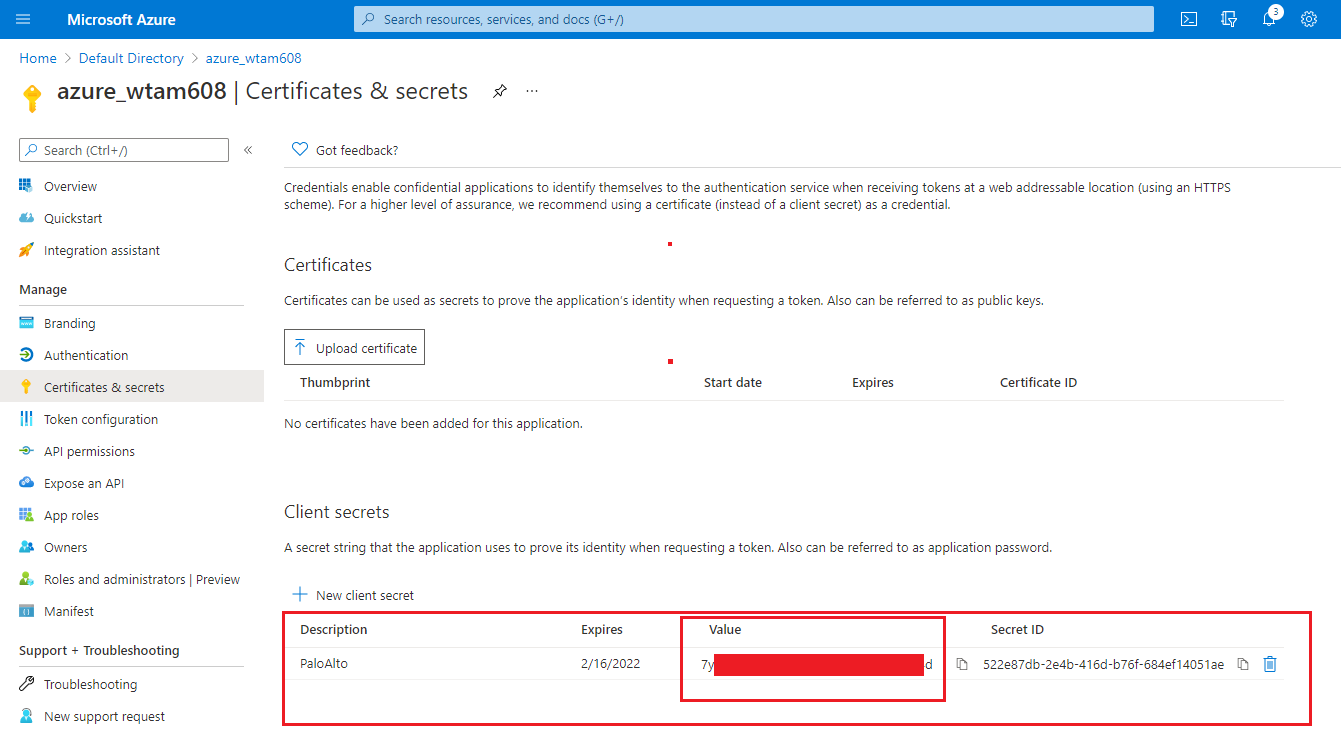 the Active Directory application (On the Azure portal, click HomeAzure Active DirectoryCertificates & secrets,