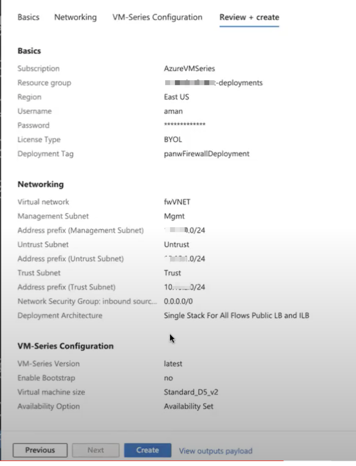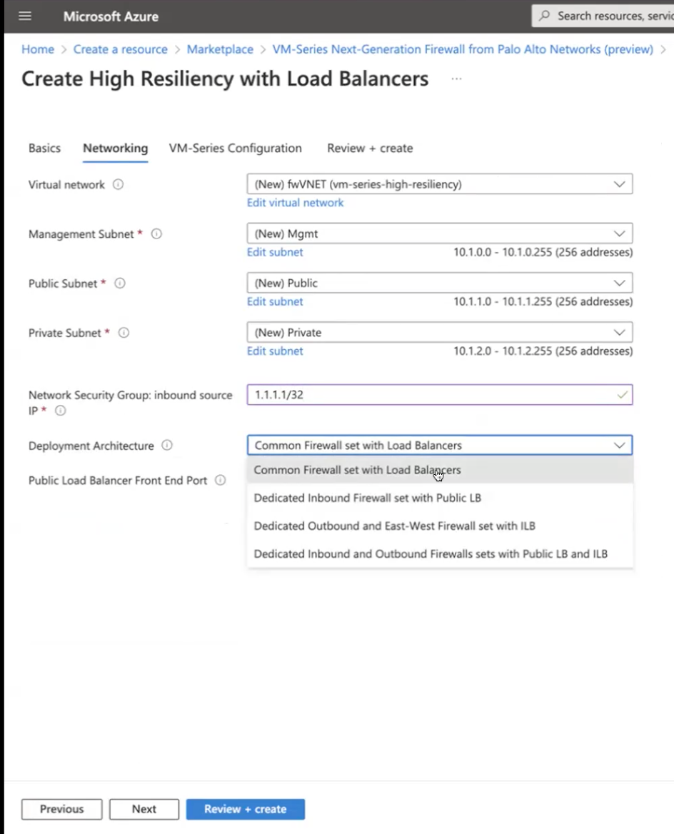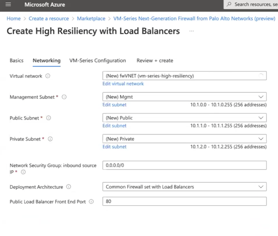 If you use the default subnets, you must review the configuration. If you use an existing VNet, you must have set up three subnets: one each for the management,trust, and untrust interfaces. If you create a new VNet, verify or change the prefixes for each subnet.
