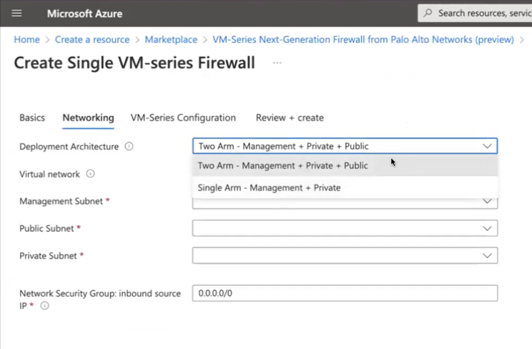1. Configure the subnets for the network interfaces--You may choose either a single arm configuration with management and trust subnets, or two arm configuration with management, trust and untrust subnets.