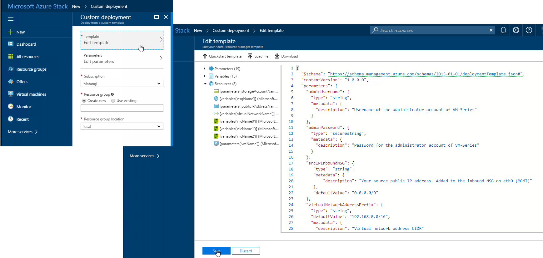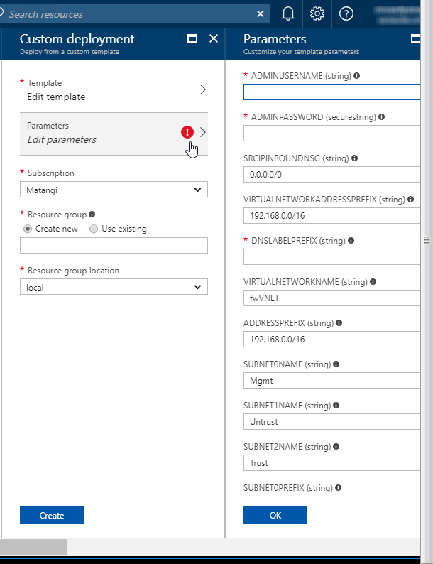 Deploy the sample GitHub template.You can deploy the firewall in a existing resource group that is empty or into a new resource group. The default VNet in the template is 192.168.0.0/16, and it deploys a VM-Series firewall has three network interfaces, one management interface on 192.168.0.0/24 subnet and two dataplane interfaces on 192.168.1.0/24 and 192.168.2.0/24 subnets. You can customize these subnets to match your needs.- Log in to the Azure Stack portal.