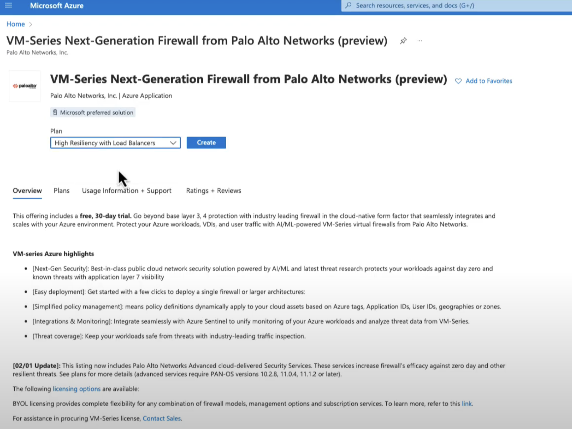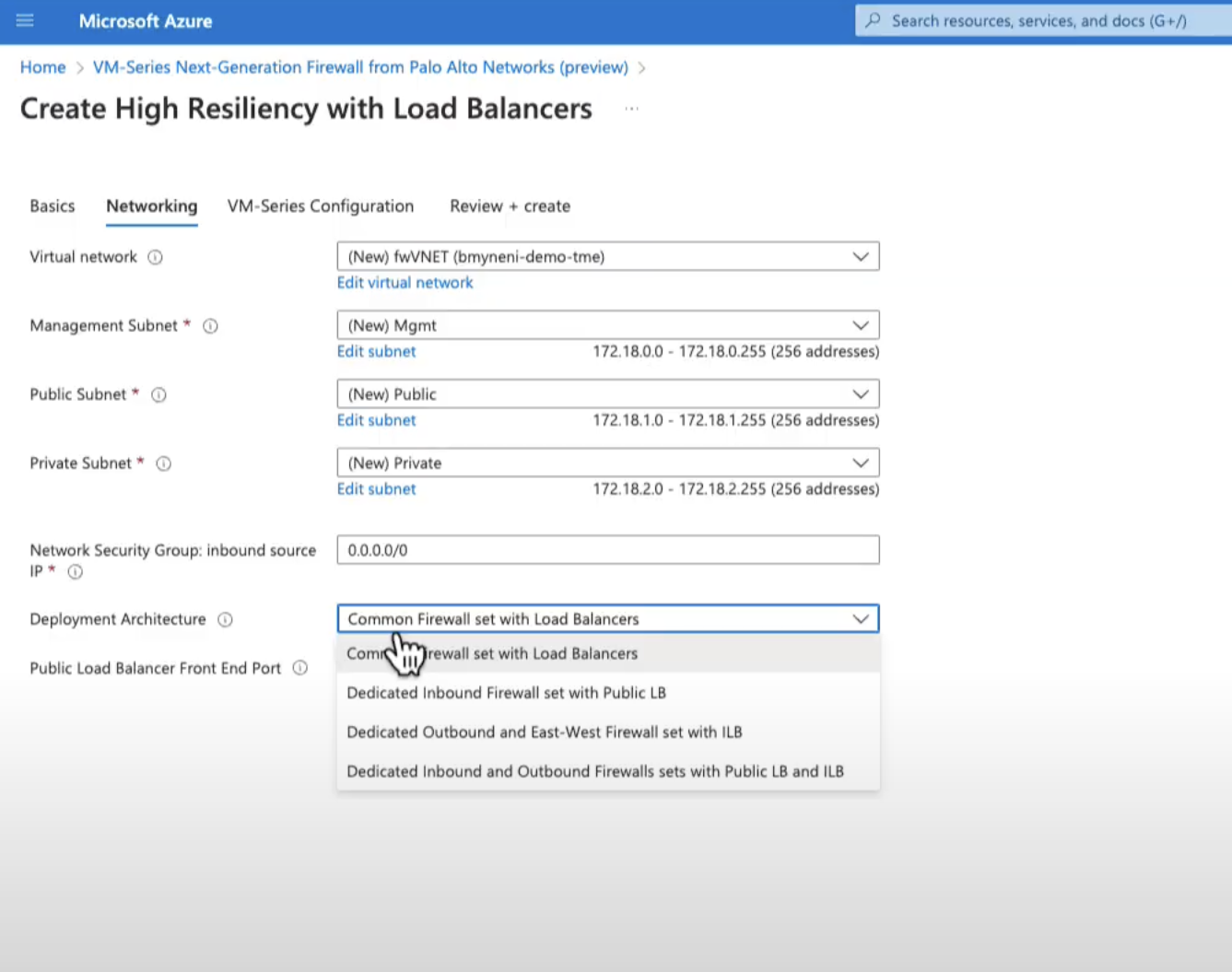 VM-Series with high resiliency load balancers support four different deployment architectures: Common firewall set with LB, Dedicated inbound firewall set with Public LB, Dedicated outbound and east-west firewall set with ILB, and Dedicated inbound and outbound firewalls sets with public LB and ILB. Select one of these for your deployment architecture. For more information, see Deploy the VM-Series Firewall from the Azure Marketplace (Solution Template).