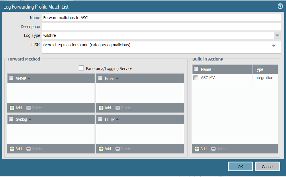 - Select Add in Built-in Actions to enable the firewalls in the device group to forward the logs to Azure Security Center.