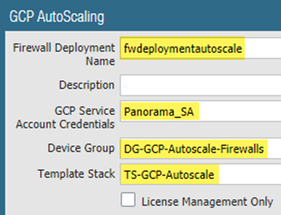 Chose the Device Group you created in Step 7, and the Template Stack you created in Step 1.Disable License Management Only to ensure traffic is secured.Commit your changes.Prepare a VM-Series Firewall Bootstrap Package for Auto Scaling