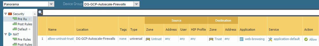Commit your changes.Create a Device Group that references the template or template stack you created in step 1.This Device Group will contain the VM-Series firewalls you create with the firewall template.- Add a security policy that allows web-browsing traffic from Untrust to Trust.In the Policies context, select the Device Group you just created. Select SecurityPre Rules and Add the following security policy.