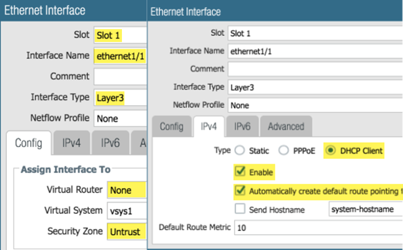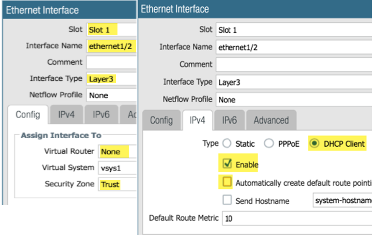 Add the ethernet1/2 (Trust) Layer 3 interface.- On the Config tab, chose the same slot as the previous step, select the Interface name (ethernet1/2), and select the Layer3 Interface Type. From the Security Zone menu, select New Zone name the zone Trust and click OK.