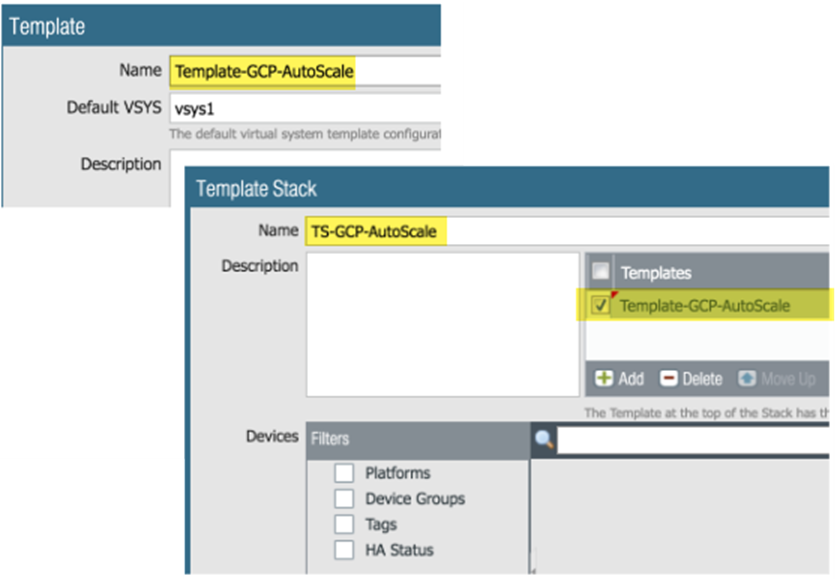 In Panorama, create assets to support the auto scaling firewall deployment.- Create a template, and a template stack that includes the template, and Commit the changes.