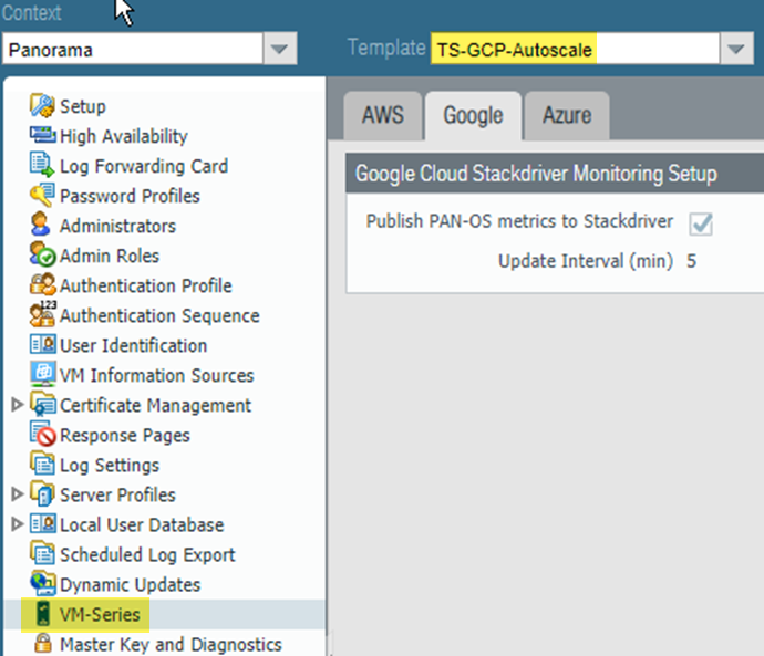 Configure Stackdriver for your auto scaling deployment.You must have the VM-Series plugin on Panorama to configure Stackdriver.- In the Device context, select the template stack you created earlier from the Template drop menu.Select DeviceVM-SeriesGoogle and click the Edit cog (). Enable Publish PAN-OS metrics to Stackdriver.