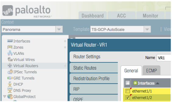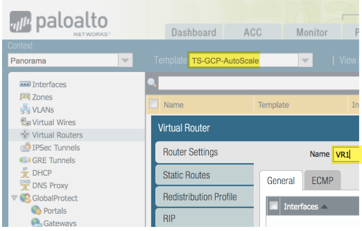 In the Network context, select either the template or the template stack. Select Virtual Routers and Add a virtual router.When the firewall template creates static routes, they are added to this virtual router.Define only one router for the auto scale deployment.