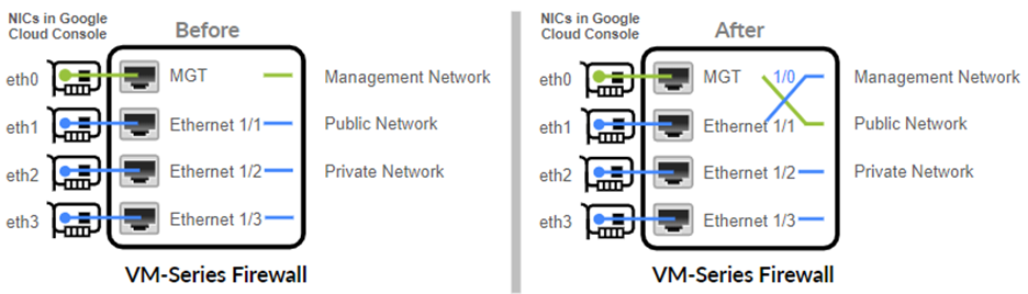 behavior on the firewall.From the Google Cloud Console you cannot confirm whether you have swapped eth0 and eth1. After swapping, you must remember that load balancing is on eth0 and the firewall management interface is eth1 so that you can properly configure Google Cloud Platform load balancing, and create security policy rules to secure load balancing to one or more VM-Series firewalls.