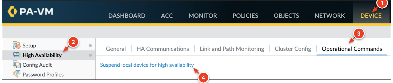 - On the Active firewall, click the Device > High Availabilty > Operational Commands.