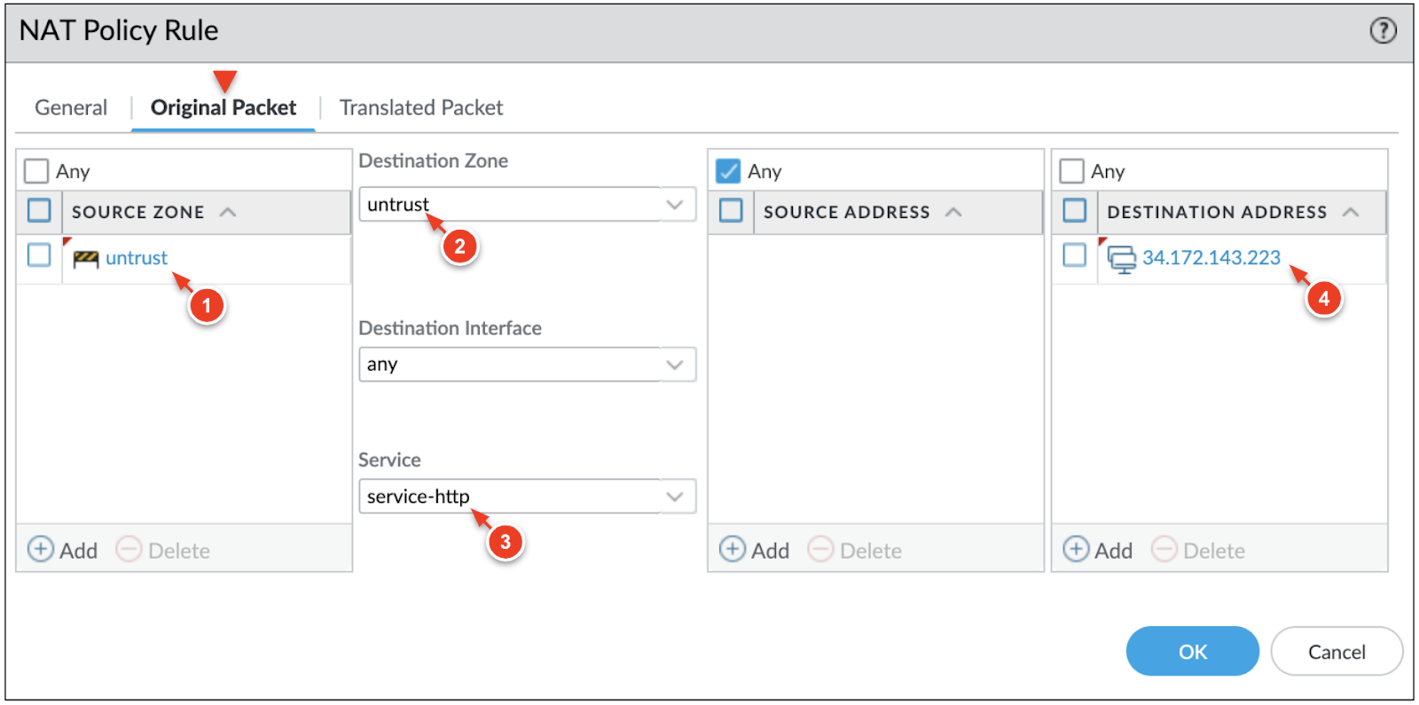 You can onboard and secure multiple internet facing applications through the VM-Series firewall. This is done by mapping forwarding rules on the external load balancer to NAT policies defined on the VM-Series firewall. - In Cloud Shell, deploy a virtual machine into a subnet within the trust VPC network. The virtual machine in this example runs a sample application for you.gcloud compute instances create my-app2 \ --network-interface subnet="panw-us-central1-trust",no-address \ --zone=us-central1-a \ --image-project=panw-gcp-team-testing \ --image=ubuntu-2004-lts-apache-ac \ --machine-type=f1-microRecord the INTERNAL_IP address of the new virtual machine.name: my-app2 ZONE: us-central1-a MACHINE_TYPE: f1-micro PREEMPTIBLE: INTERNAL_IP: 10.0.2.4 EXTERNAL_IP: status: RUNNINGCreate a new forwarding rule on the external TCP load balancer.gcloud compute forwarding-rules create panw-vmseries-extlb-rule2 \ --load-balancing-scheme=EXTERNAL \ --region=us-central1 \ --ip-protocol=L3_DEFAULT \ --ports=ALL \ --backend-service=panw-vmseries-extlbRetrieve and record the address of the new forwarding rule.gcloud compute forwarding-rules describe panw-vmseries-extlb-rule2 \ --region=us-central1 \ --format='get(IPAddress)'(output)34.172.143.223On the active VM-Series, click Policies > NAT > Add and enter a name for the rule.Configure the Original Packet as follows: