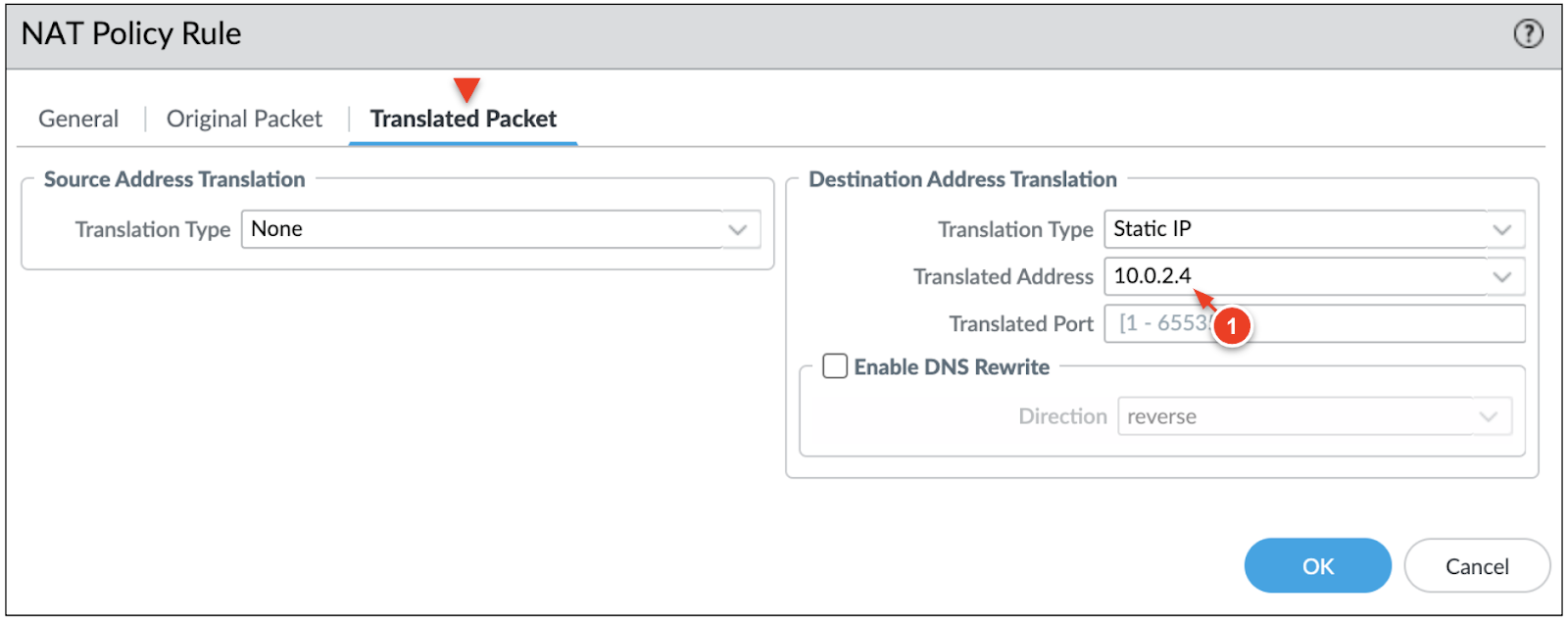 In the Translated Packet tab, configure the Destination Address Translation as follows:- Translated Type: Static IP