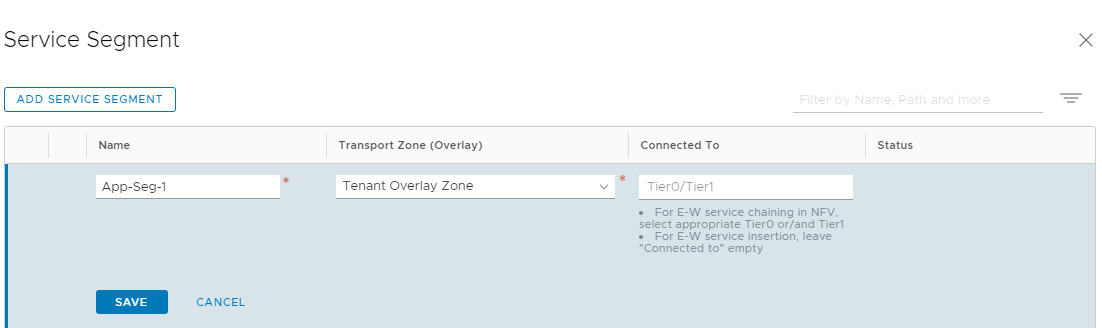 Click Add Service Segment.Enter a descriptive Name.Select a Transport Zone (Overlay).The VM-Series firewall must be attached to an Overlay transport zone. Guest VMs can be attached to a VLAN or Overlay transport zone. The transport node hosting the guest VMs and the VM-Series must be configured with an Overlay transport zone.Click Save and Close.
