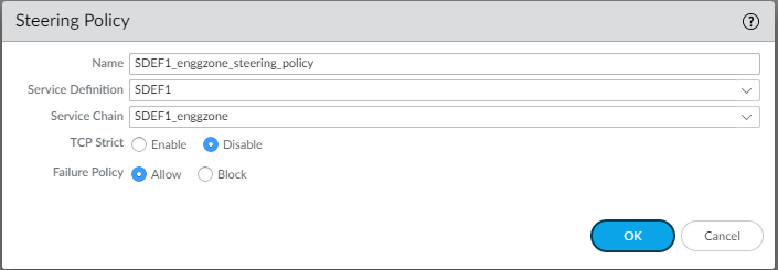 Use the following procedure to manually create steering policy.- Select PanoramaVMwareNSX-TNetwork IntrospectionPolicy.Click Add.Enter a descriptive Name for your steering policy.The steering policy name cannot include any spaces.Select a Service Definition from the drop-down.Select a Service Chain from the drop-down.( Optional) Enable TCP Strict. This option is disabled by default.Choose the Failure Policy— Allow or Block. Allow is the default.Click OK.Commit your changes to Panorama.