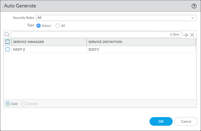 Commit your changes.Auto generate new steering rules.If you auto-generate steering policy, you must also auto-generate steering rules. And if you manually create steering policy, you must also manually create steering rules.The following steps are for specifying service managers instead of selecting All.- Select PanoramaVMwareNSX-TNetwork IntrospectionRule.Click Auto Generate.Select the type of Security Rules from the drop-down—All, Pre Rulebase only, or Post Rulebase only. The security rules are pulled from the service definitions specified in the following steps.For Type, choose Select.Click Add to specify the Service Manager(s) and Service Definition(s).Select a Service Manager from the drop-down.Click Add to select the service definition(s).Click OK.Click OK to finish or Add to specify additional service managers and service definitions.(Optional) Click on an auto-generated rule to modify the default options.