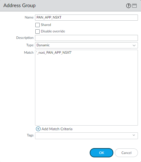 - Select ObjectsAddress Groups.Verify that you are configuring the dynamic address groups in a device group associated with an NSX-T service definition.Click on the name of a previously created NSX-T dynamic address group.Edit the match criteria.For the dynamic address group to become a security group in NSX-T Manager, the match criteria string must be enclosed in single quotes with the prefix _nsxt_ followed by the exact name of the Address Group. For example, ‘_nsxt_PAN_APP_NSX’.Repeat this process for each security group you require.