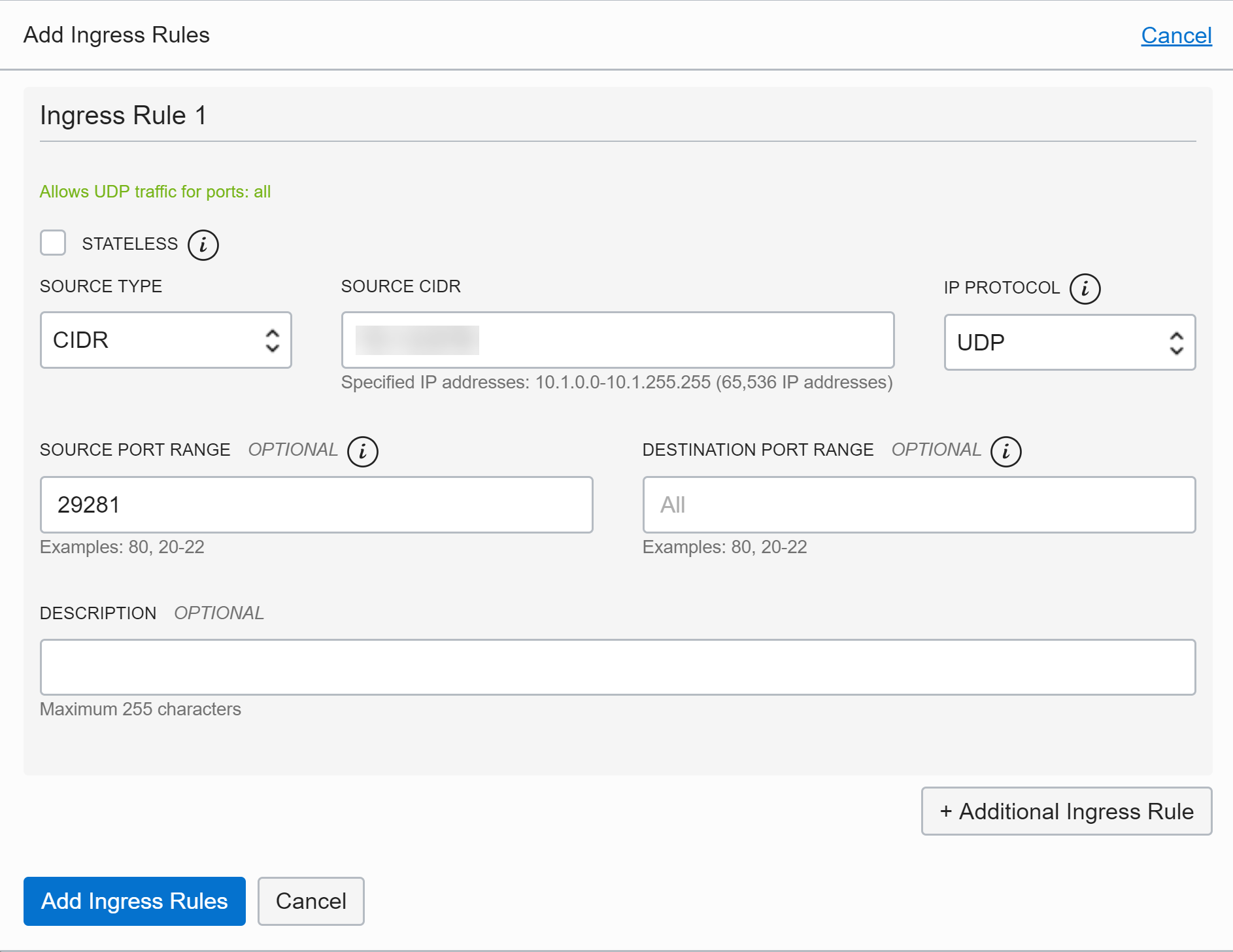7. If the transport mode is UDP, enter 29281 into Source Port Range. If the transport mode is IP, enter 99 into Source Port Range.