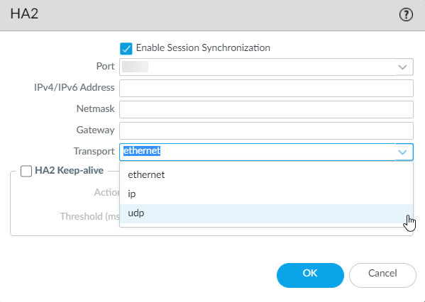• HA2 interface—this interface has a single private IP address on each HA peer. The HA2 interface is the data link peers use to synchronize sessions, forwarding tables, IPsec security associations, and ARP tables.