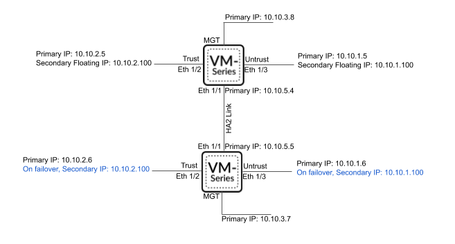 • Untrust and trust interfaces—each of these data interfaces on the active HA peer require a primary and secondary IP address. Upon failover, when the passive HA peer transitions to the active state, the secondary private IP address is detached from the previously active peer and attached to the now active HA peer.
