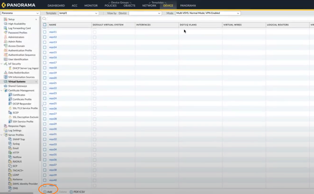 3. Navigate to Virtual Systems and then click Add to configure virtual systems on your firewall.