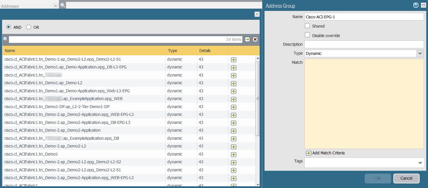 Some browser extensions may block API calls between Panorama and the APIC which prevents Panorama from receiving match criteria. If Panorama displays no match criteria and you are using browser extensions, disable the extensions and Synchronize Dynamic Objects to populate the tags available to Panorama.