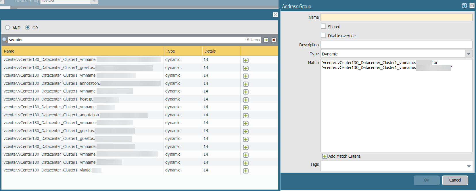 Some browser extensions may block API calls between Panorama and vCenter which prevents Panorama from receiving match criteria. If Panorama displays no match criteria and you are using browser extensions, disable the extensions and Synchronize Dynamic Objects to populate the tags available to Panorama.