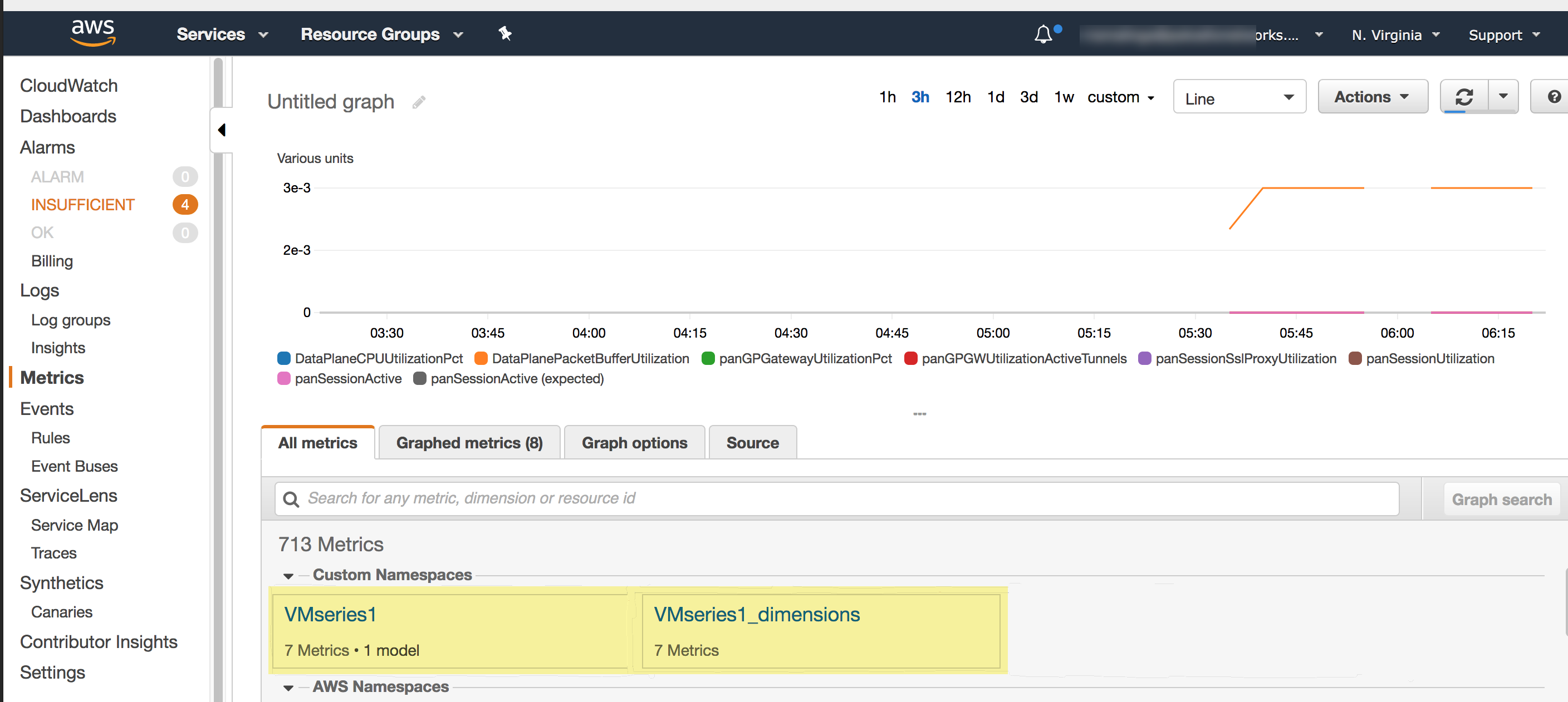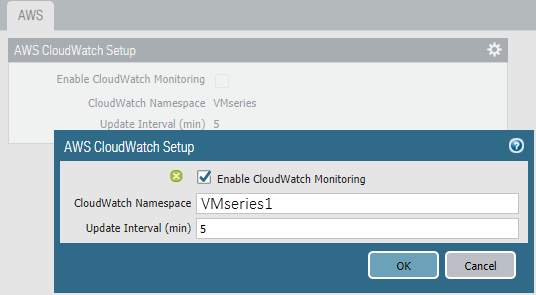 - Enter the CloudWatch Namespace to which the firewall can publish metrics. The namespace cannot begin with AWS.The aggregated metrics for all VM-Series firewall in an HA pair or auto scaling deployment are published to the namespace you entered above. The namespace with the _dimensions suffix that is automatically created enables you to filter and view metrics for an specific VM-Series firewall using the hostname or AWS instance ID metadata attached to the firewall.