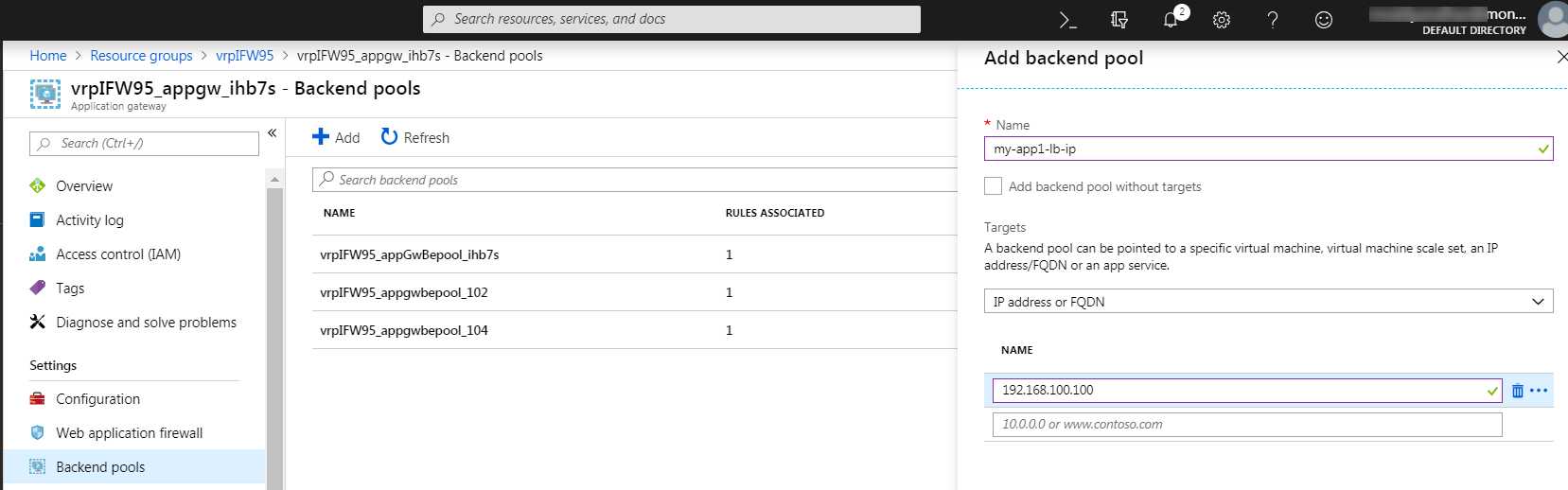 - Add the IP address of the internal Load Balancer that fronts the application to the Application gateway configuration in the inbound firewall Resource Group.