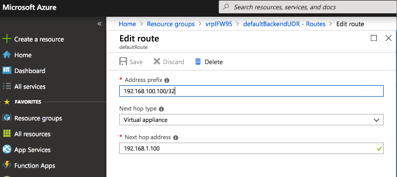 - In the default BackendUDR, add a route with application subnet as the destination, and the next hop IP address as that of the internal load balancer that fronts the firewall VMSS.