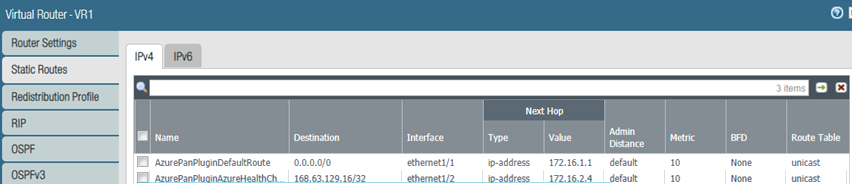 virtual router on Panorama.After you deploy the Hub template, a default route and a route for health checks to the managed firewalls is automatically added to the virtual router in the template stack for the VM-Series firewalls launched with the Hub template. And the Azure Application Insights instrumentation key is also automatically available. You need to verify that these routes and the are included so that the firewalls are properly configured and can send metrics for monitoring the autoscaling thresholds. the Synchronizing Config with Azure button. Follow the same procedure if you do not see routes populated for the Hub template stack as well.
