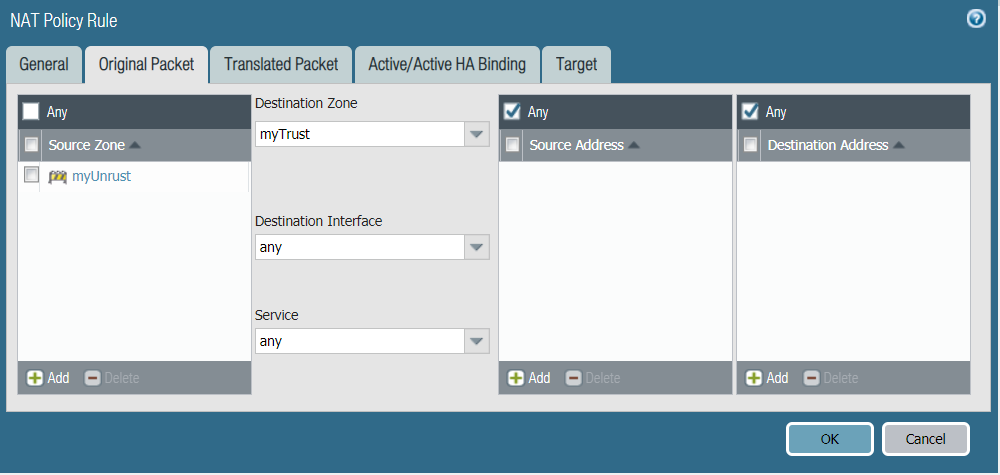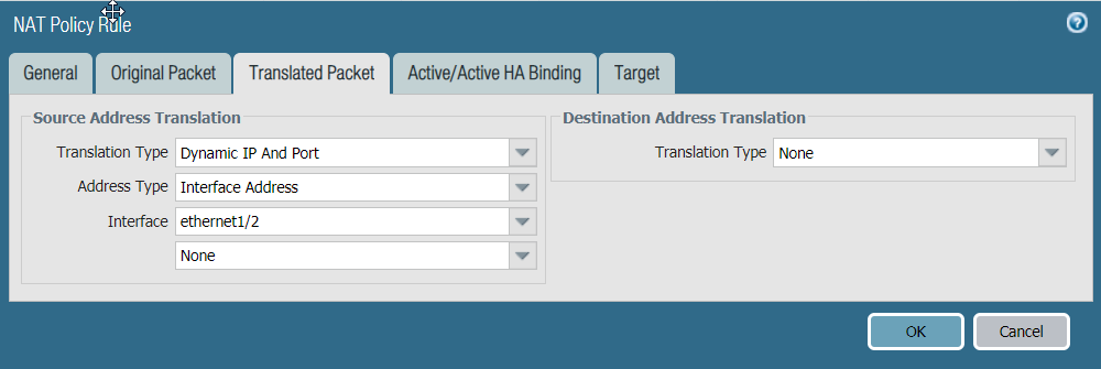 - Select the device group that you plan to use for the configuration of the Inbound Firewall template, and add a NAT policy rule to direct traffic from the untrust zone to the trust zone, and set the translated packet to use the trust interface (ethernet1/2) IP address so that the return traffic is sent back to the trust interface on the firewall.