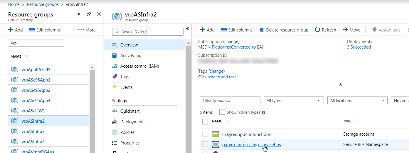- Launch the Infrastructure template.This allows you to launch the Azure Service Bus and the Azure function. You need to get the SB name, SB credentials (shared access key) for use later on the Panorama Azure plugin. You will also need the Function URL to deploy the firewall template (for inbound and hub).