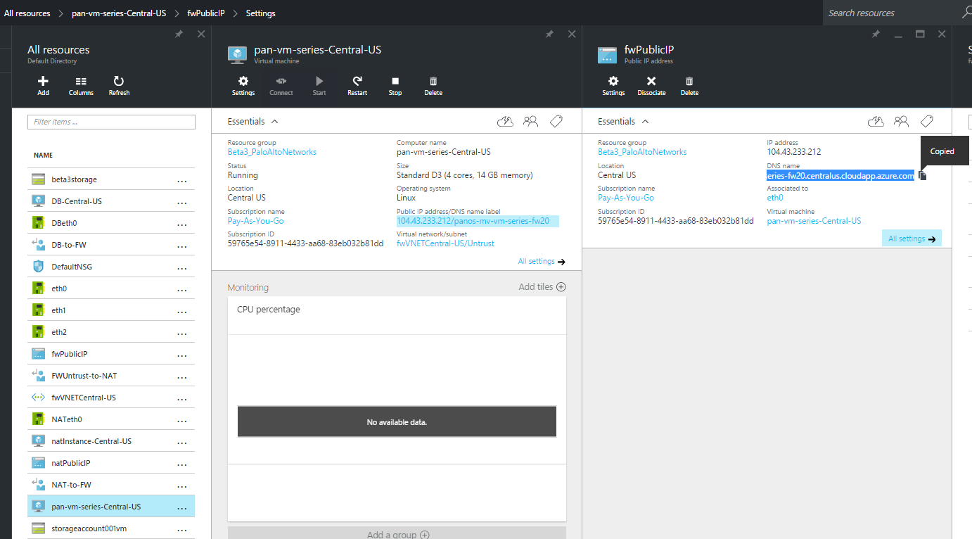 - On the Azure portal, in All Resources, select the VM-Series firewall and view the full DNS name for the firewall.