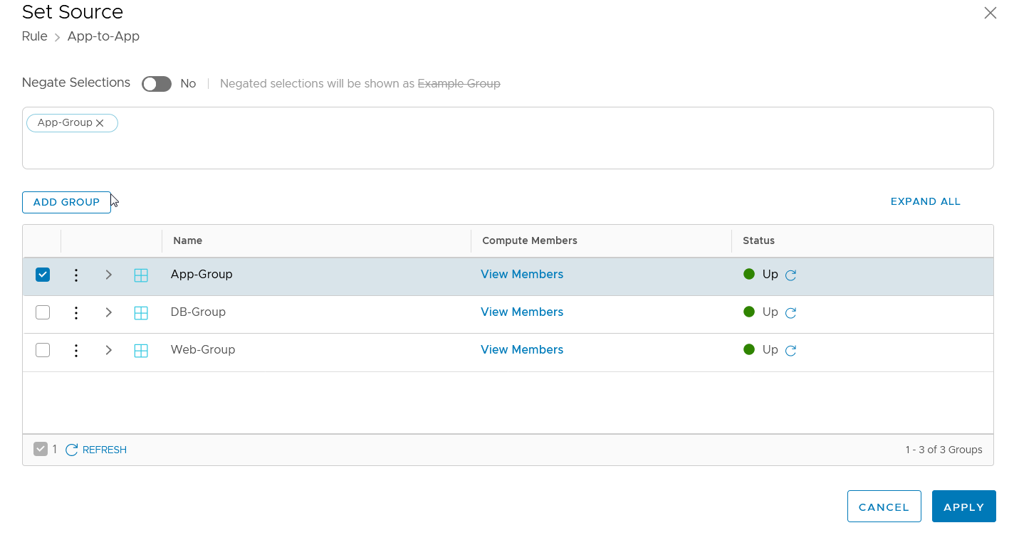 - Select Groups to apply the rule to virtual NICs of members virtual machines in the specified group or groups.