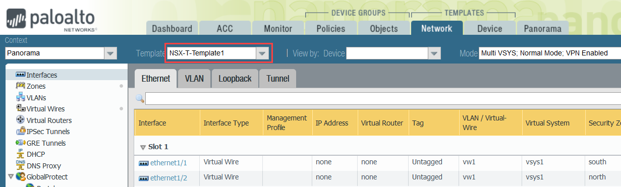 - The second zone named north, type virtual-wire, and contain ethernet1/2.