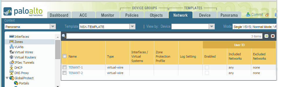 show interface all total configured hardware interfaces: 2 name id speed/duplex/state mac address --------------------------------------------------- ethernet1/1 16 auto/auto/up d4:f4:be:c6:af:10 ethernet1/2 17 auto/auto/up d4:f4:be:c6:af:11 aggregation groups: 0 total configured logical interfaces: 6 name id vsys zone forwarding ------------------- ----- ---- ----------------- ethernet1/1 16 1 vwire:ethernet1/2 ethernet1/1.3 4099 1 TENANT-1 vwire:ethernet1/2.3 ethernet1/1.4 4100 1 TENANT-2 vwire:ethernet1/2.4 ethernet1/2 17 1 vwire:ethernet1/1 ethernet1/2.3 4355 1 TENANT-1 vwire:ethernet1/1.3 ethernet1/2.4 4356 1 TENANT-2 vwire:ethernet1/1.4 - On the web interface of the VM-Series firewall, select ObjectsAddress Groups and
