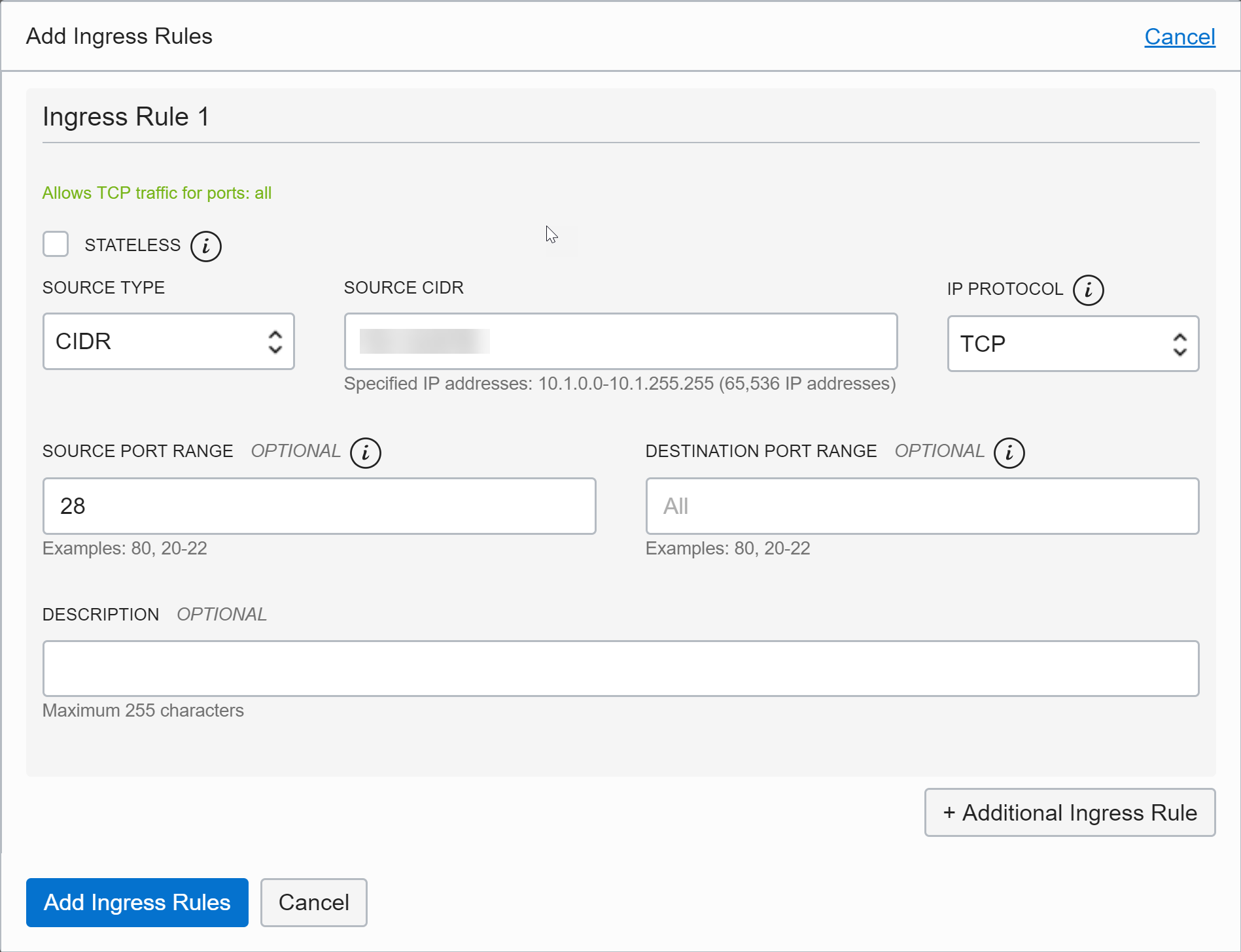 7. Click +Additional Ingress Rule. You need to create two additional rules for TCP ports 28260 and 28769.