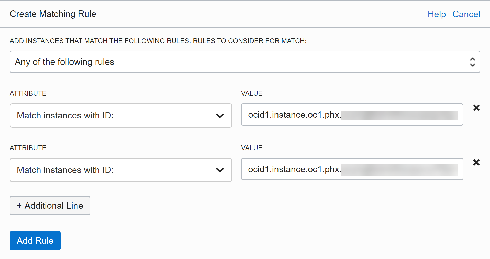 5. Select Match instances with ID: from the Attributes drop-down and paste one of the peer OCIDs into the Value field.
