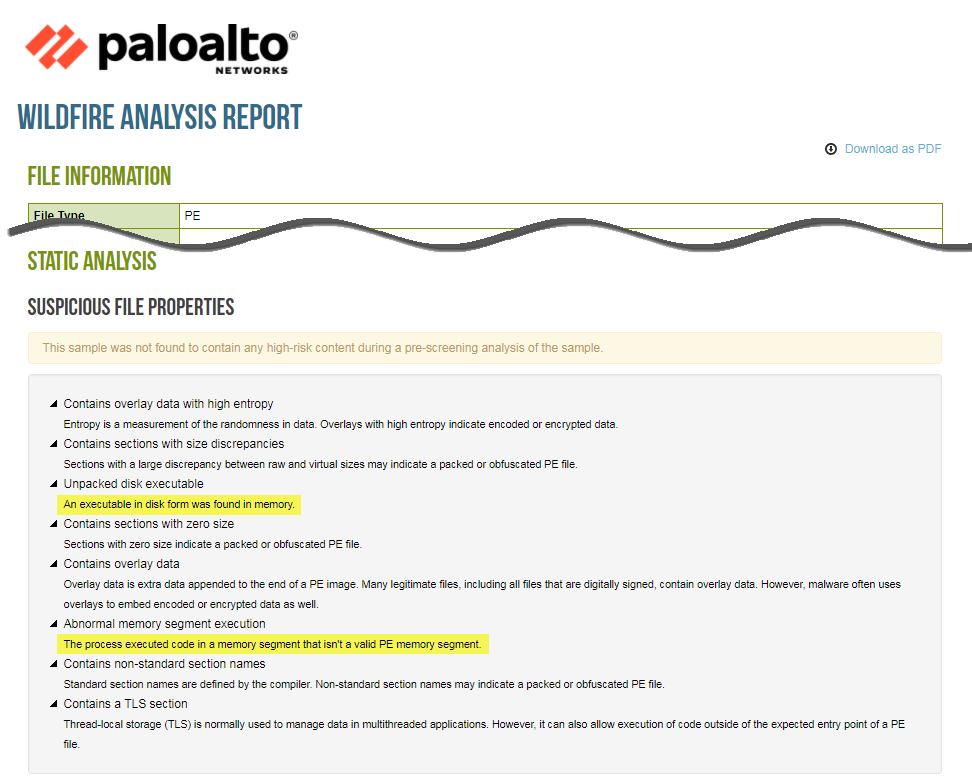 • Dynamic unpacking behaviors are listed under the Suspicious File Properties heading of the WildFire Analysis Report.