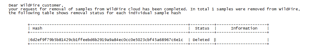After the samples are removed from the WildFire cloud, you will receive a confirmation email with the details of the request. This includes a list of the samples that were requested to be deleted, and the removal status of each sample. This process can take up to 7 days.
