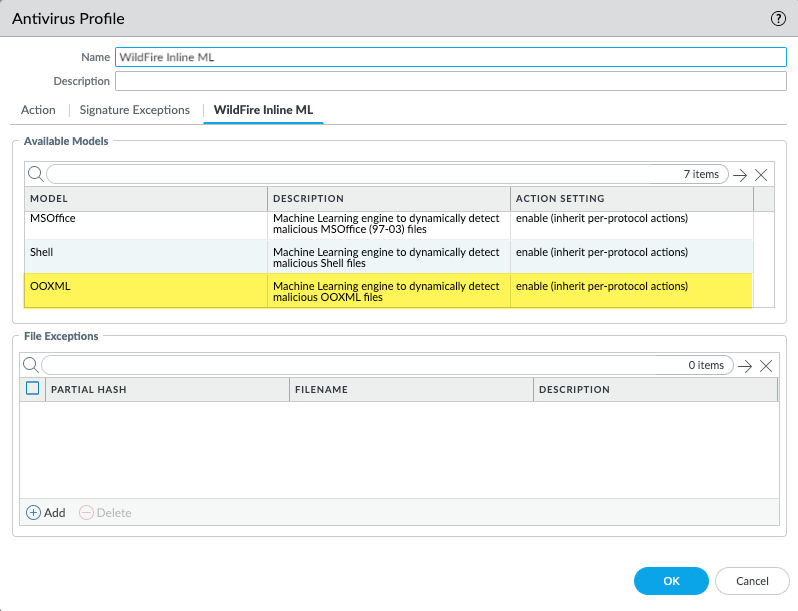 3. Select WildFire Inline ML and apply an Action Setting for the new WildFire inline ML model. This enforces WildFire inline ML Actions settings for each protocol on a per-model basis. In addition to the currently available classification engines, OOXML should now be available. If this model is unavailable, verify that you have content release 8825 or later installed on the firewall.